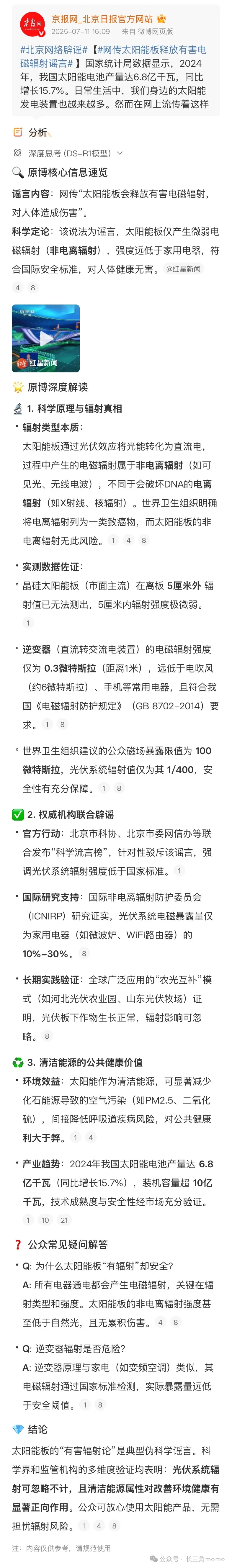 還有類似 #網傳太陽能板釋放有害電磁輻射謠言#一針見血的指出:太陽能板的“有害輻射論”是典型偽科學謠言。科學界和監管機構的多維度驗證均表明:光伏系統輻射可忽略不計,且清潔能源屬性對改善環境健康有顯著正向作用。公眾可放心使用太陽能產品,無需擔憂輻射風險。
