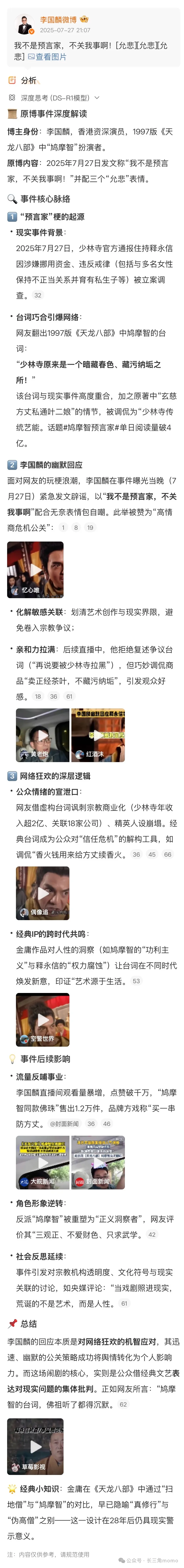 前幾天,我也隨手刷刷微博,算是找選題,發現一個挺有意思的事,就是關於釋永信事件的“鳩摩智預言梗”,鳩摩智的扮演者李國麟要站出來闢個謠,説這個事兒和自己沒關係,引用的也是智搜的結果。