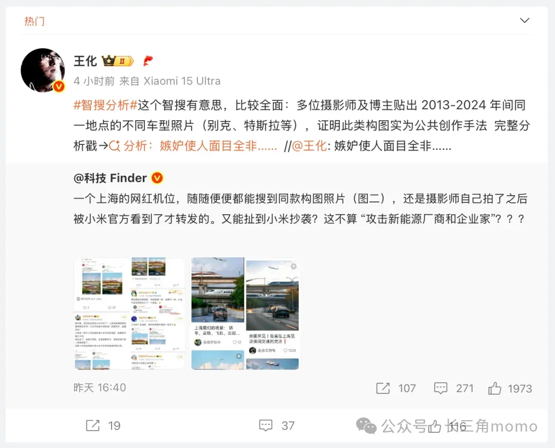 前幾天,小米的王化還發了一條有關微博智搜的內容。一位攝影師在某個上海網紅機位自己拍個一組小米汽車,然後市面上又莫名其妙地扯到了小米抄襲。