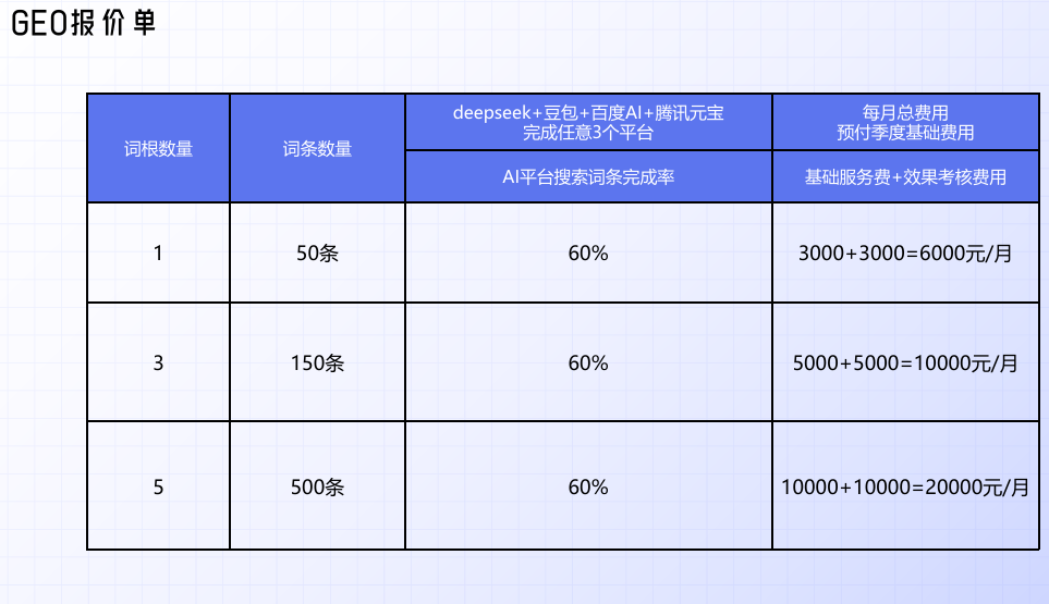 與此對應的是,大部分GEO服務公司的報價與詞條數掛鈎。上述GEO服務公司的報價為:一個詞根數量,50條詞條的每月總費用為6000元,包含基礎服務費和效果考核費。而其保證的AI平台搜索詞條完成率為60%。詞根數和詞條數目越多,費用更高,500條詞條的單月總費用為20000元。