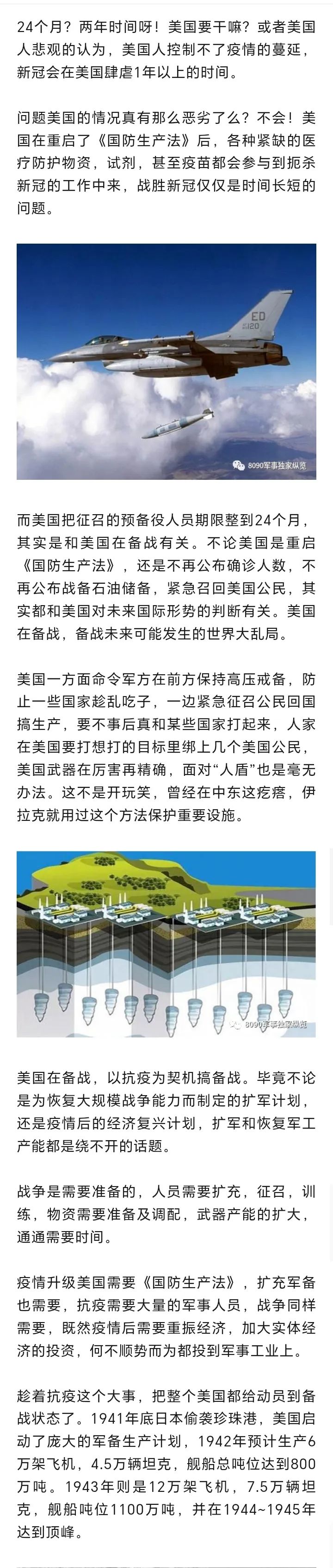 美國人藉着抗疫的當口(美國對新冠持放任態度),重啓了國防生產法,並且超額徵召了預備役人員……美國當時那架勢,就是防備因為疫情虛弱被人可能的“偷雞”準備的。
