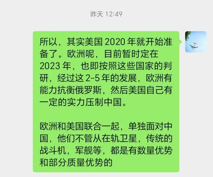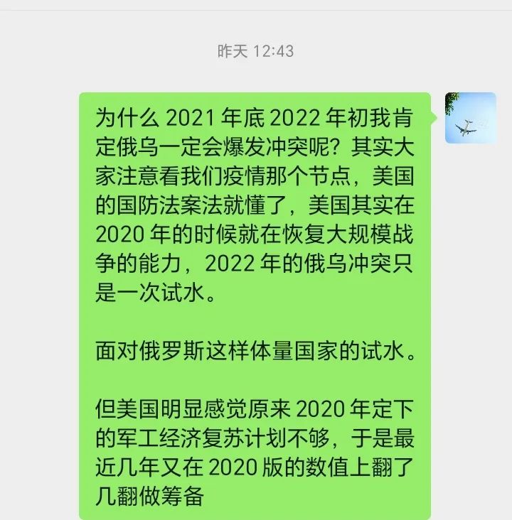 所以2022年俄烏一定爆發衝突,其實2020年就有跡象了,美國提早做了準備,美國把抗疫準備的產業軍工動員能力,在2021年以後轉了部分到烏克蘭,武裝了烏克蘭,而俄羅斯在疫情的動作,應對和表態,顯示了自己的虛弱,最起碼讓歐美看到了俄羅斯經濟也許難以為繼的可能(2021-2022年西方的看法),所以俄烏衝突爆發從來不是偶然,而是必然,儘管當時絕大多數(99.99%)的人看不出來,但因果其實在爆發前2年已經註定了。