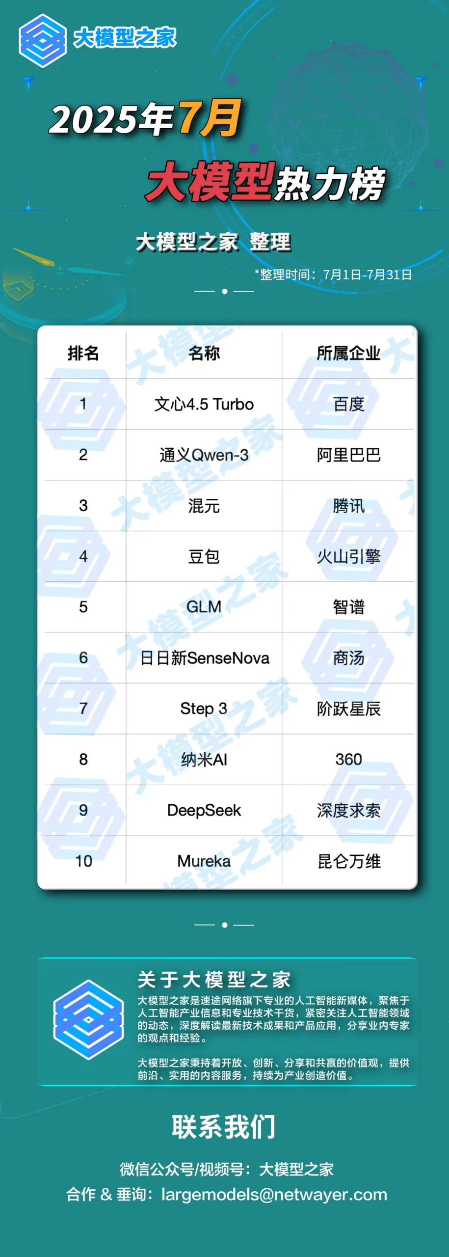 大模型之家2025年7月熱力榜:WAIC再燃AI激情,BAT榜單再聚首_風聞