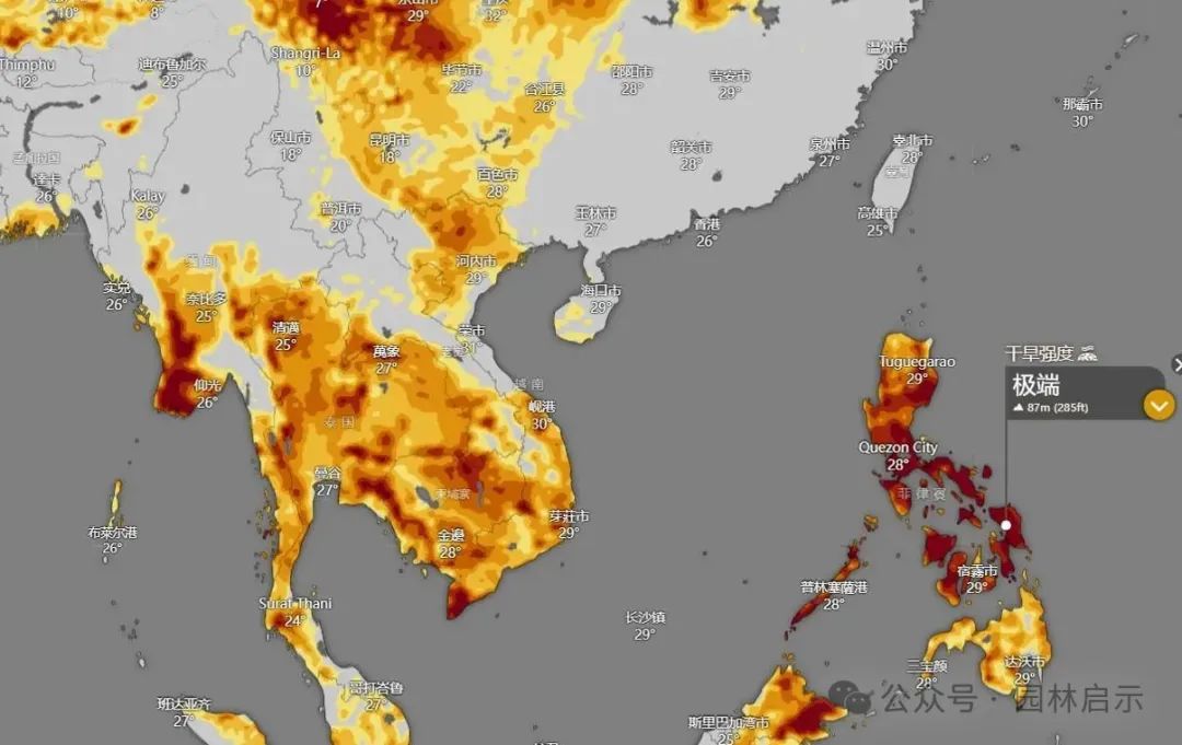 這不僅是一次局部乾旱,它的範圍、強度都已經突破了常年極值。常年多雨的東南亞都也出現了極端乾旱。
