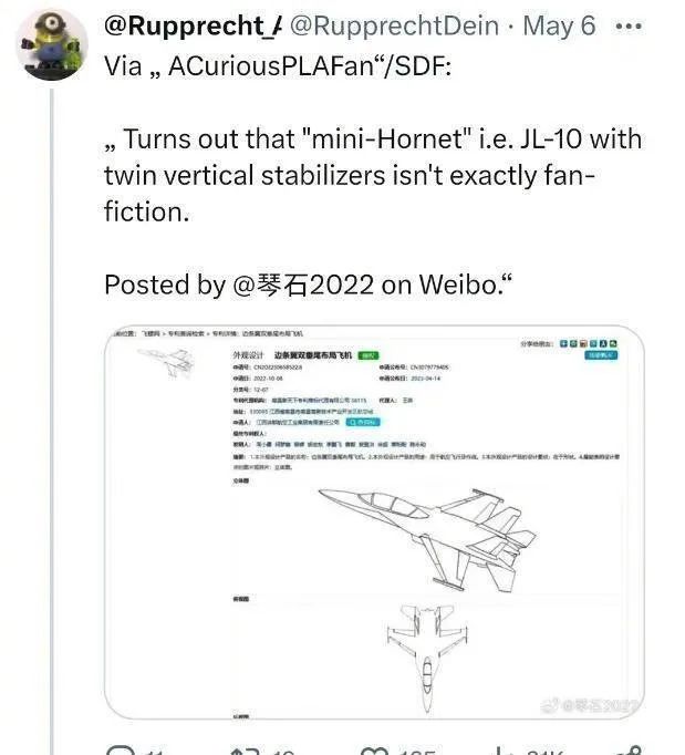 其實,這款雙垂尾的新型戰機並非首次進入大眾視野。早在半年前,就有軍事博主披露過其獨特的雙垂尾外形特點,由於該機採用了粗壯的雙輪前起落架,因此認為這是一款新型彈射型的艦載機戰鬥教練機。隨後該機也引起了海外軍事博主的關注和討論,例如德國軍事專家魯普雷希特在今年年初的博文中就指出,中國洪都似乎正在致力於研發一款雙垂尾版的“獵鷹”戰鬥教練機。