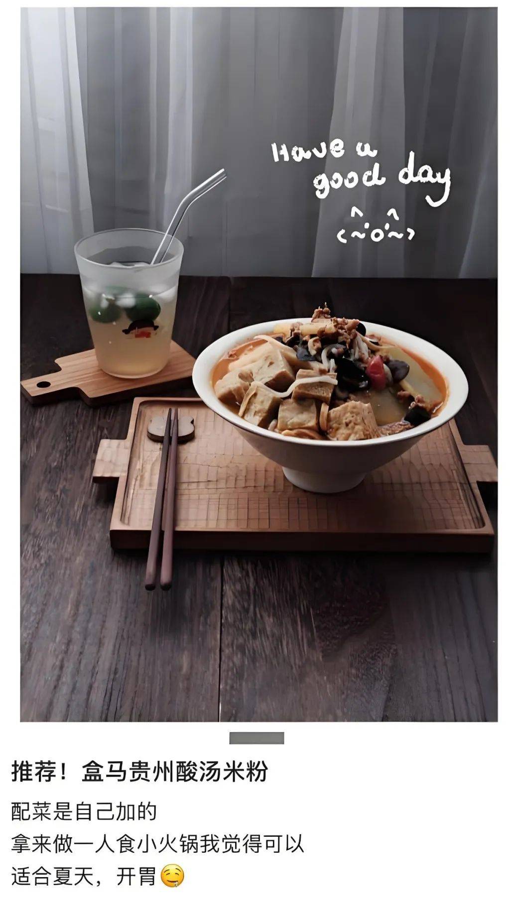 社交媒體大量關於紅酸湯牛肉粉的二創分享:在原有基礎上加青菜、豆腐乾、滷蛋,把牛肉粉吃出飯店的酸湯火鍋味。
