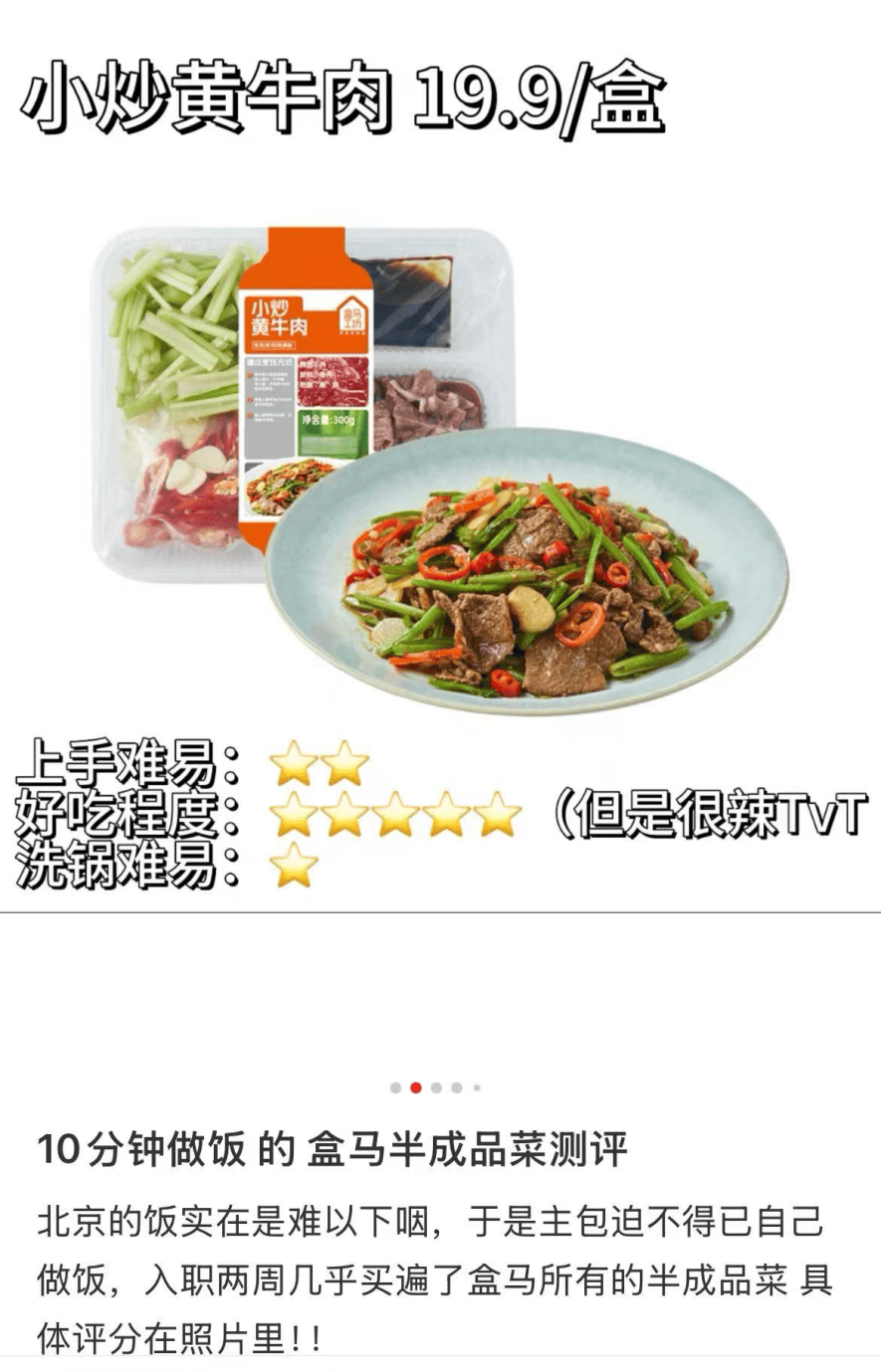 除了全國各地的特色美食,盒馬免洗快手菜憑藉原料直觀可見,操作簡單備受歡迎。全國民友好的小炒黃牛肉、宮保雞丁、魚香肉絲、醃篤鮮等經典家常菜也適合不會做飯又想吃好的年輕人在10分鐘內快速完成美味的一餐。“炒出來秒變大廚”,“顯得自己做菜水平很高”等評價也常出現在社交媒體盒馬推薦菜筆記的評論區。