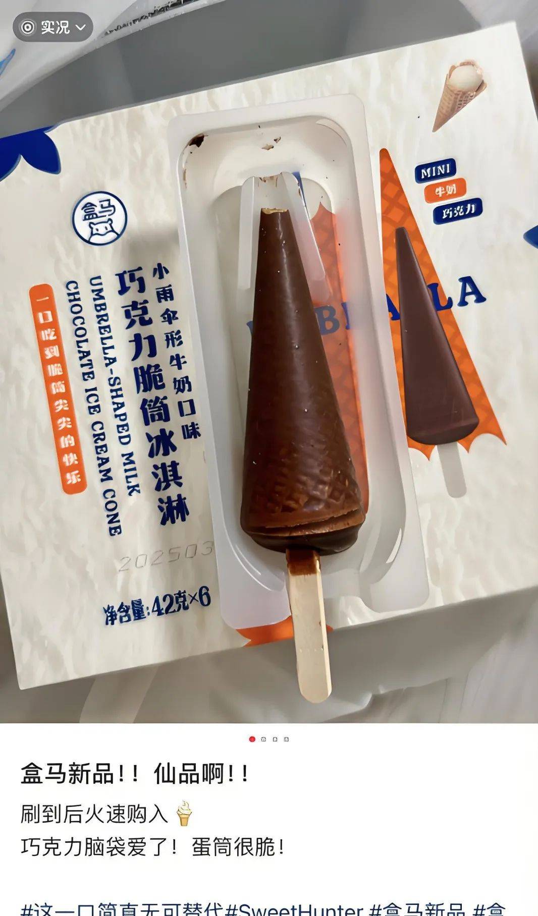 夏季是專屬於消暑新品的高光季,前兩年,盒馬推出的爆漿玉米冰淇淋、話梅糖冰淇淋曾靠顏值和新奇口味俘獲消費者的味蕾,今年推出的小雨傘脆筒冰淇淋甜筒則專門根據甜筒愛好者的快樂點打造,脆筒口感滿分,成為社交媒體美食博主的流量密碼,曬圖即可收穫大瀏覽量。