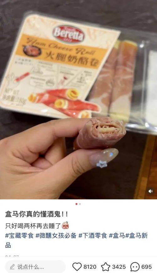 除了跟隨季節變化出新,熱點話題也是啓發盒馬上新的重要靈感,比如著名的包含雙色蘋果意式薩拉米和雙色蜜瓜薩拉諾火腿的“酒鬼套餐”,在盒馬APP的商品標籤為“大人睡前故事”和“酒懵子必備”,套餐上市後在社交媒體收穫了多篇以“盒馬你真懂酒鬼”為標題的筆記分享,諸多網友親切調侃這次上新“背後定有高人指點”。