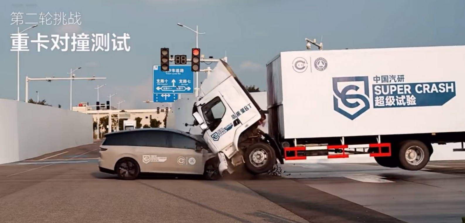 2024年8月,理想汽車的視頻號就上線了一則“理想L9重型卡車前後夾擊碰撞試驗挑戰成功”的短視頻稱,2024款理想L9成功通過中國汽研“SUPER CRASH超級試驗”重型卡車前後夾擊試驗工況挑戰。