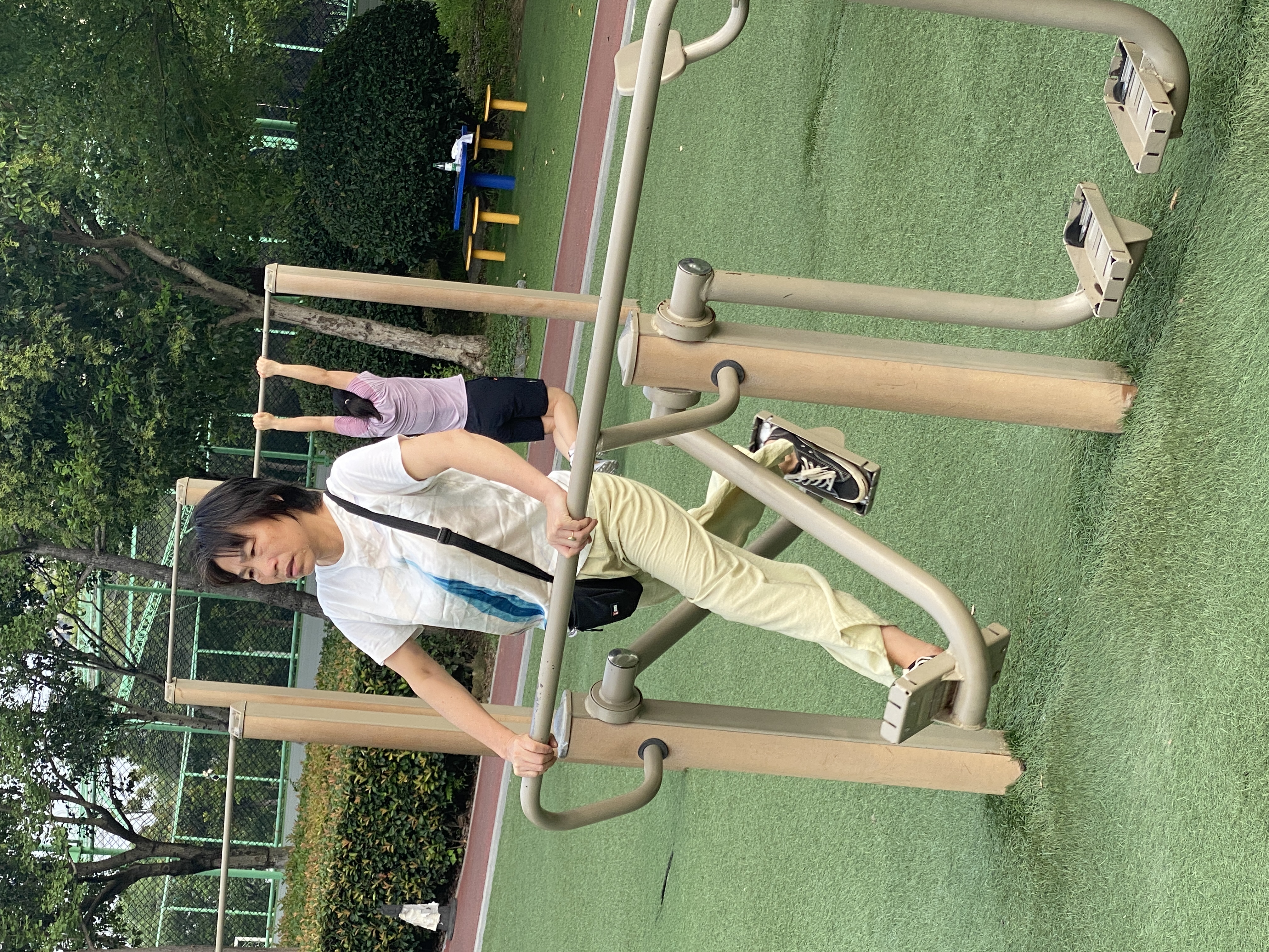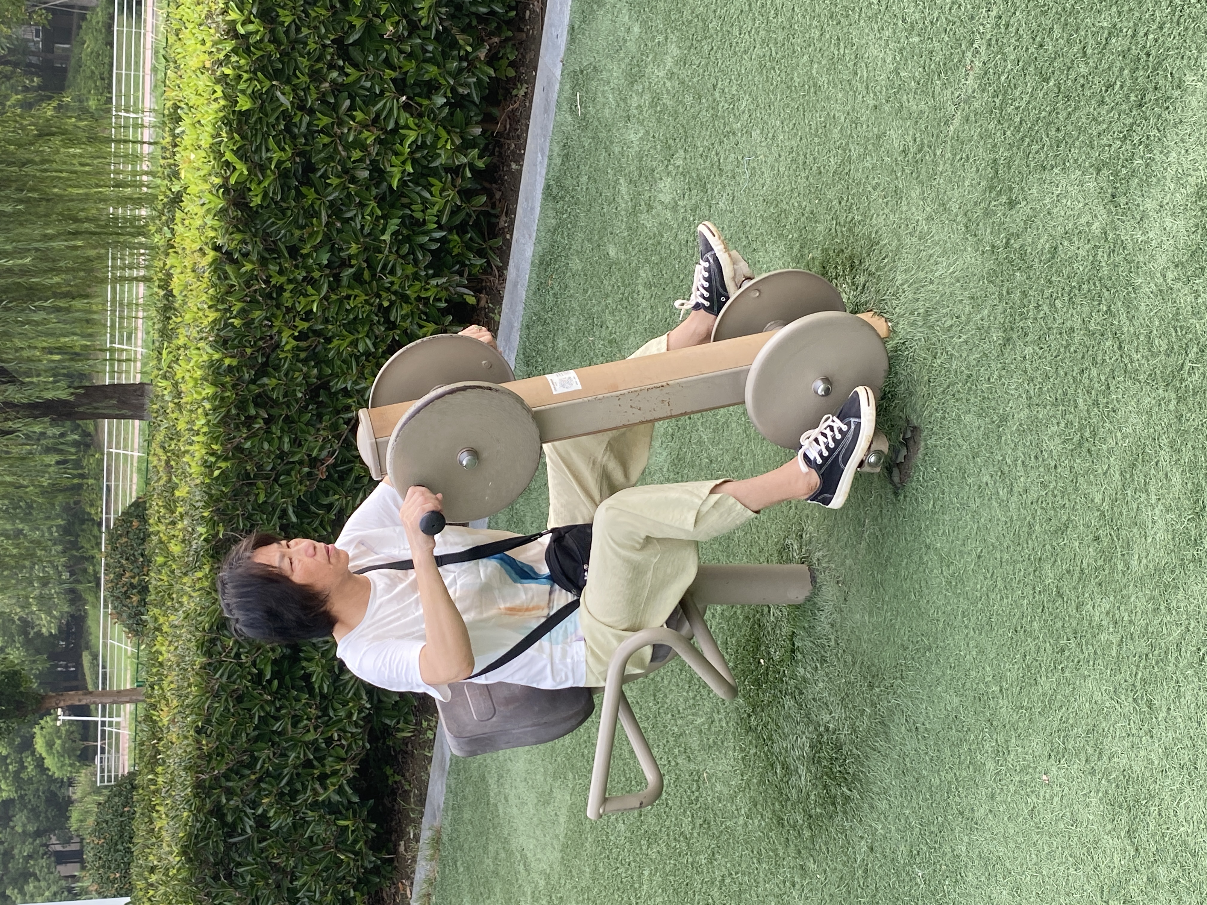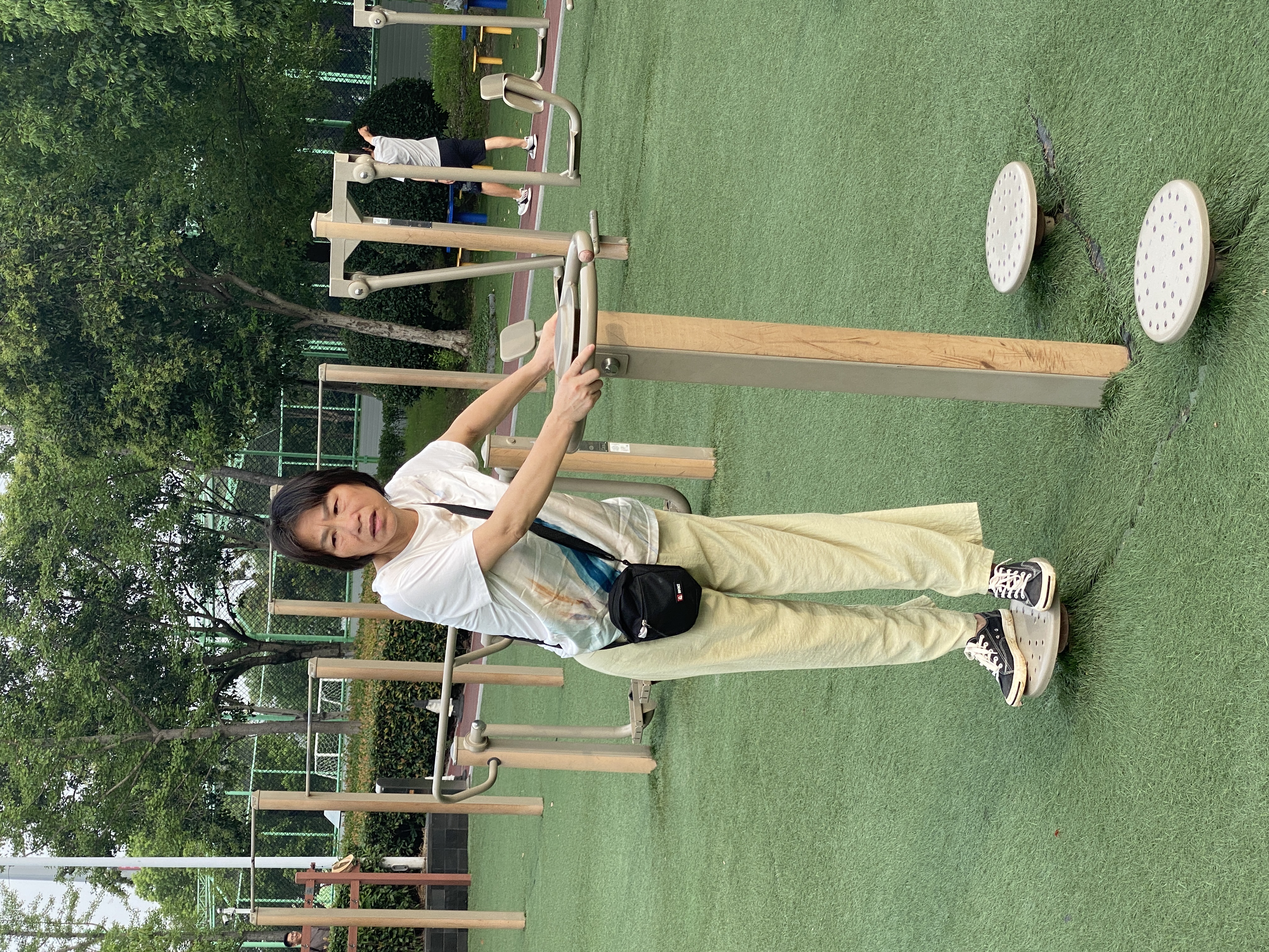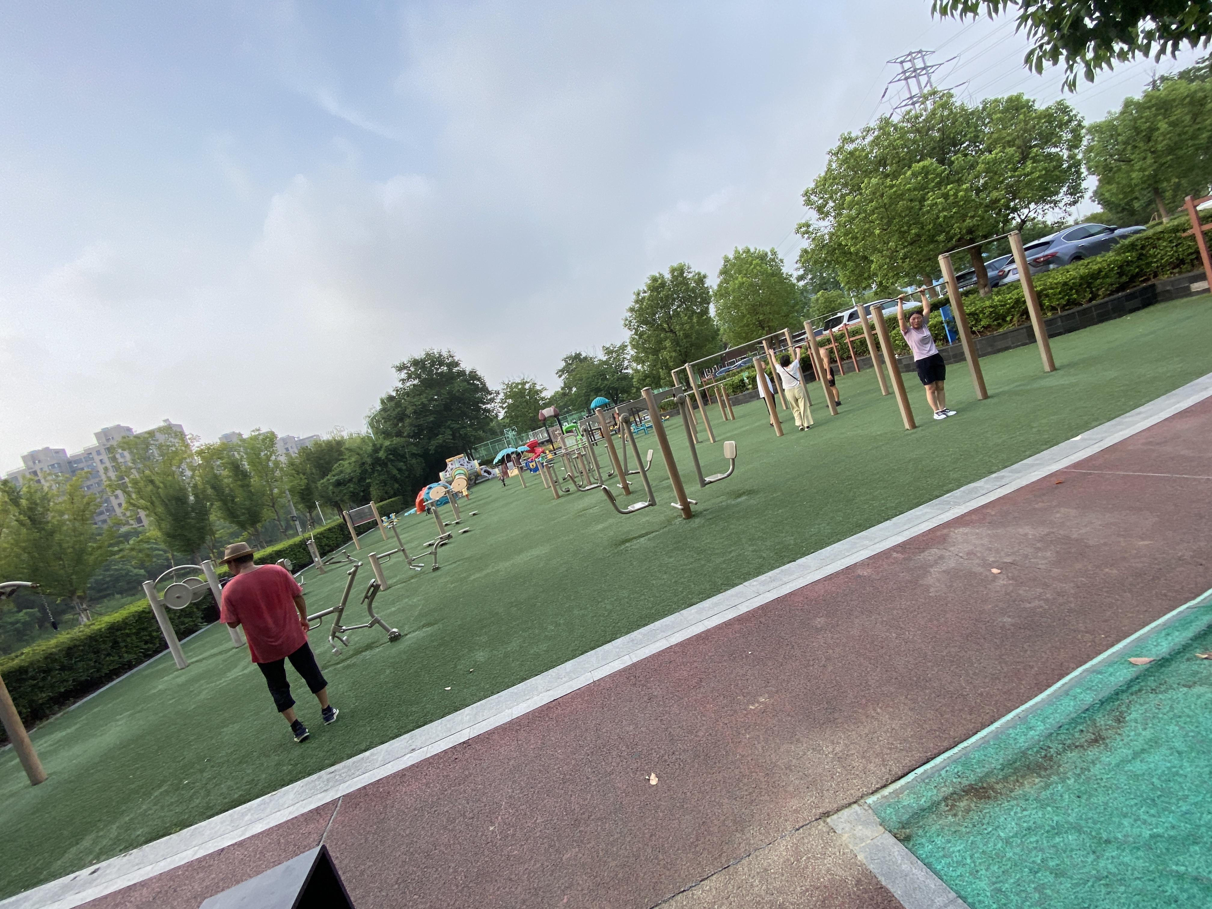 成人健身區裏,各種健身器材旁也都有了身影。一位頭髮花白的老人正在使用漫步機,他的動作雖然緩慢,但每一步都十分穩健。他的臉上帶着平靜的微笑,似乎在享受着這份清晨的寧靜與運動的愜意。旁邊,我的夫人朱元珍正認真地拉伸,她總説晨練前的拉伸是對身體的温柔提醒,此刻她手臂舒展,腰背挺直,動作標準又舒展,指尖彷彿能觸到晨光裏的暖意,想必是在為接下來的鍛鍊做好充分準備。還有幾位年輕人,正在進行力量訓練,他們專注的神情和堅定的眼神,彰顯着對健康生活的追求。