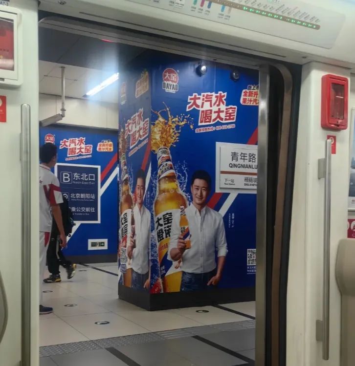 品牌效應上,縱使人們不熟悉大窯,但線下鋪天蓋地的“吳京拿着大窯”就足以在視覺上潛移默化地洗腦絕大多數消費者,即便能躲過巨幅廣告牌,也終究躲不過餐館裏充當吳京人形立牌的大窯冰櫃與桌上放好的**“京液”**。