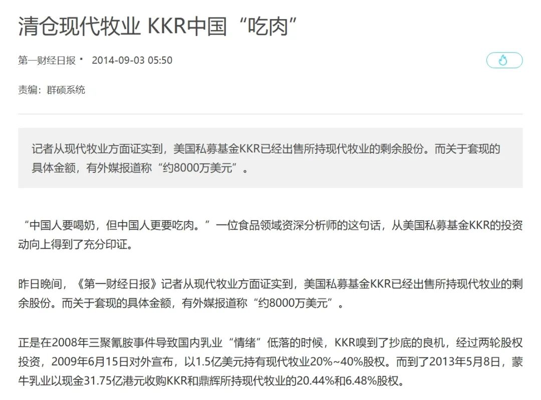 畢竟KKR作為當今風格比較激進的私募巨頭,在中國投資超過40家企業,版圖覆蓋了多個領域的多家行業巨頭,其曾在2008年三聚氰胺事件後逆勢投資“現代牧業”,並在2013年將所持現代牧業股份售予蒙牛乳業,收穫了初始投資三倍多的回報。