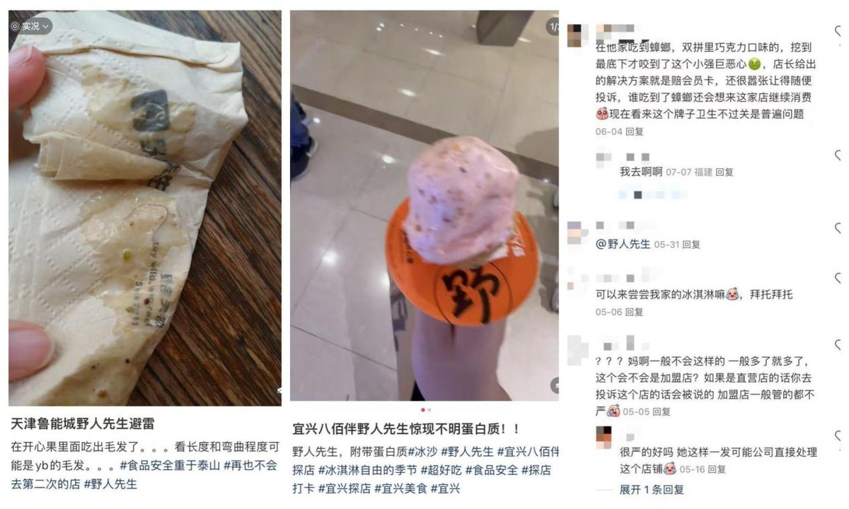 值得一提的是,野人先生還多次出現食品安全問題。多位網友在小紅書發帖稱,“吃出毛髮”,“驚現不明蛋白質”,“吃到蟑螂”。