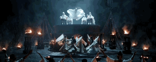 “上天的使者”薩達在皓白的月光下鬼舞,鼓者白衣白綾,薩達白具遮面,黑髮紅綾,一幕好似黑白無常登台雀舞。