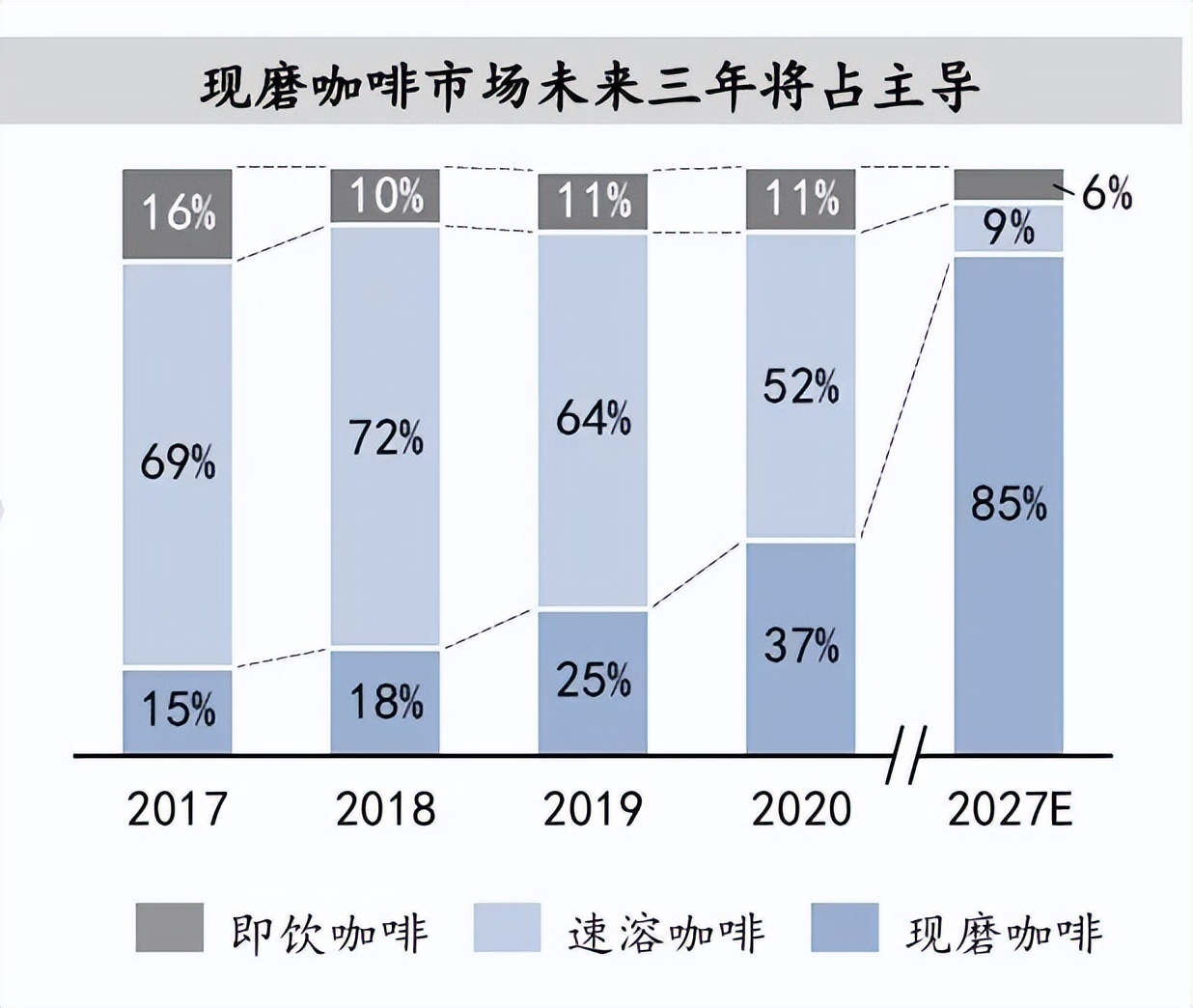 中國咖啡產業報告預計,現磨咖啡的市場份額將從2020年的37%提升至2027年的85%,進而取代速溶咖啡成為消費主流。