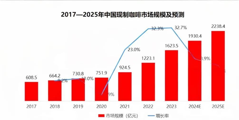 (2017-2025年中國現磨咖啡市場規模及預測 來源:《2023—2024中國咖啡行業年度發展報告》)