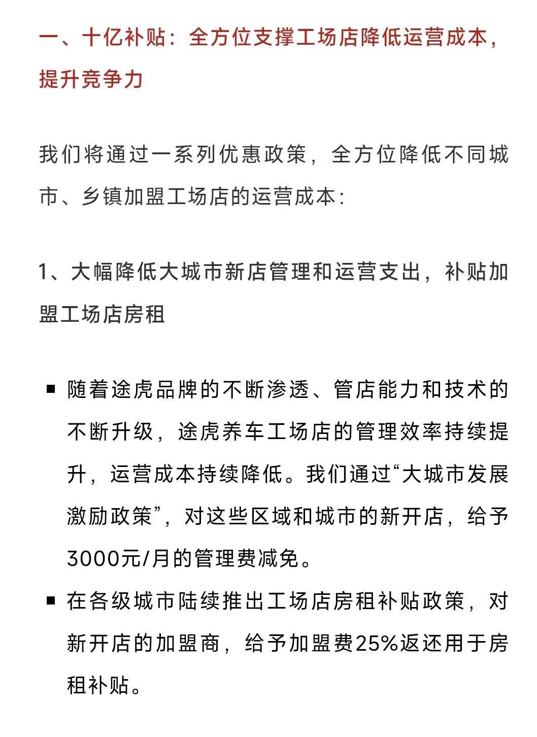 加盟商唐堯透露,途虎的補貼政策主要針對大城市地區的新開店,而途虎近年的加盟商更偏向下沉市場,且減免的管理費用對於新店的運營成本而言杯水車薪。另外,返還的25%加盟費在日常經營中也是九牛一毛。