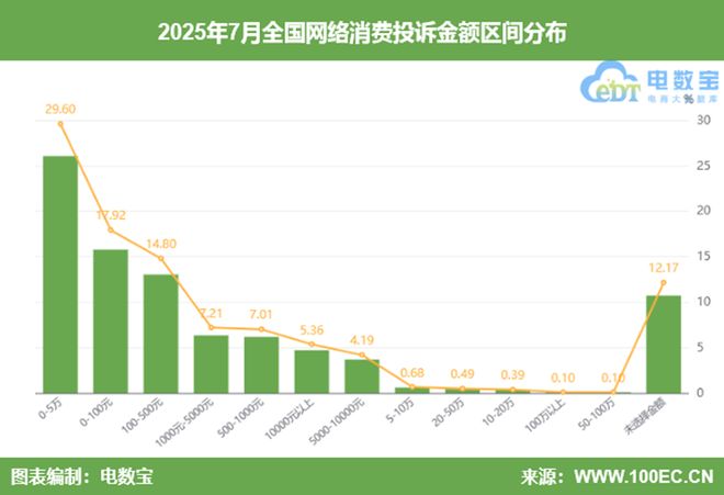 據“電訴寶”顯示, 7月投訴金額分佈主要集中在0-5萬(29.60%)、0-100元(17.92%)、100-500元(14.80%)、1000元-5000元(7.21%)、500-1000元(7.01%)、10000元以上(5.36%)、5000-10000元(4.19%)。