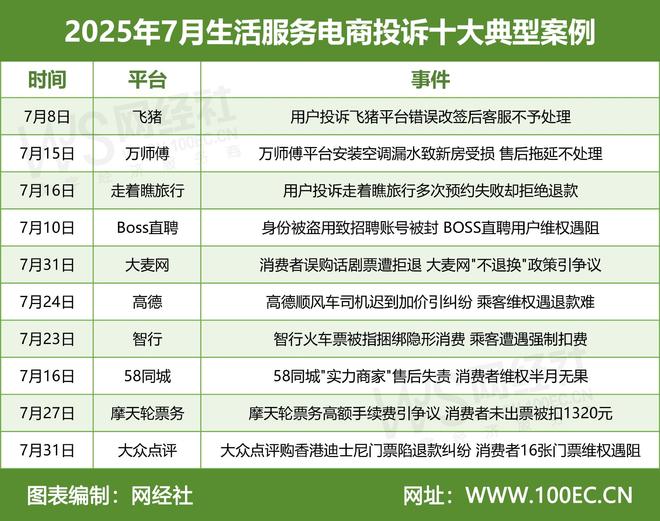 在數字生活消費領域,據“電訴寶”受理用户維權案例,我們從中選取十大典型投訴案例,涉及飛豬、萬師傅、走着瞧旅行、BOSS直聘、大麥網、高德、智行、58同城、摩天輪票務、大眾點評。