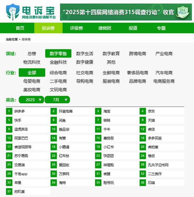 投訴量TOP10依次為:拼多多、抖音電商、淘寶、京東、快手、閒魚、轉轉、天貓、途虎養車、唯品會;