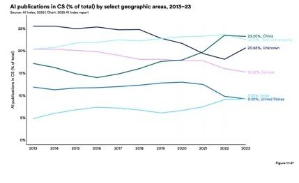圖為2013-2023年按選定地理區域劃分的計算機科學(CS)領域出版物數量(佔總數的比例),從地區來看,中國大陸AI論文發表總量領先。2023年,中國大陸機構的AI論文在全球總髮表量中佔比23.2%,被引量佔22.6%。(圖源:斯坦福大學《AI指數報告2025》)