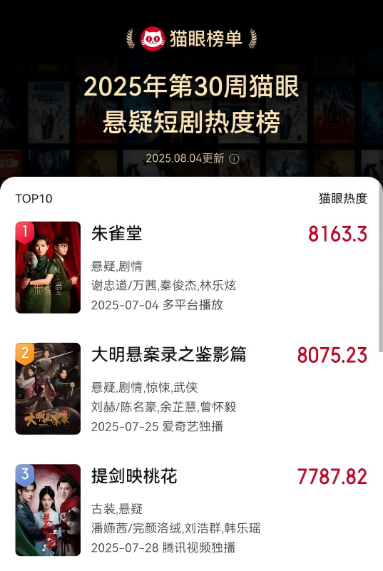 《鑑影篇》作為《大明懸案錄》三部曲的收官之作,於7月25日登陸愛奇藝,播出後登上了2025年第30周貓眼懸疑短劇熱度榜TOP2。它大膽摒棄了時下流行的快餐套路,以五樁離奇的案件為線索,用劇情案情講述現實輿情。