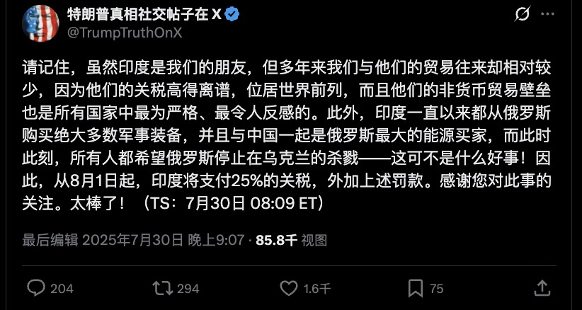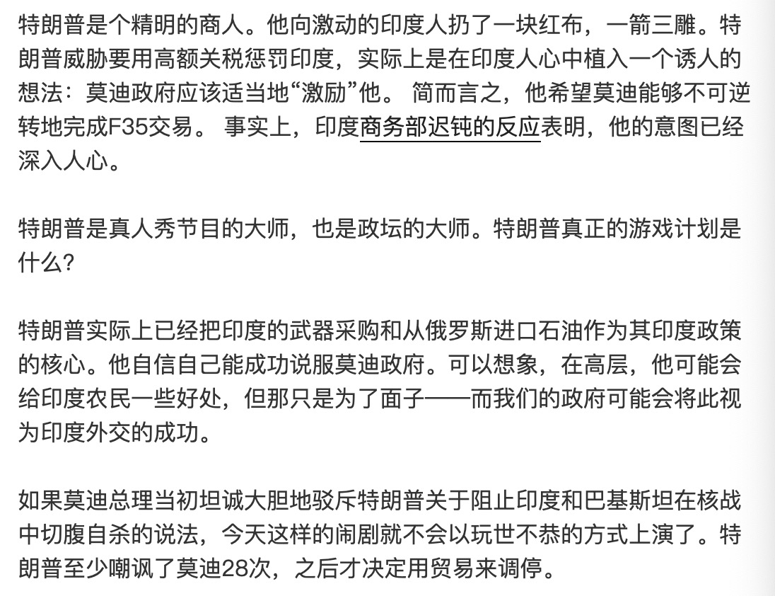 特朗普在真相社交上發表的第二篇帖子幾乎完全指責印度是俄羅斯的盟友:“我不在乎印度如何對待俄羅斯。他們可以一起摧毀各自已經奄奄一息的經濟,我才不在乎。我們和印度幾乎沒有什麼生意來往……同樣,俄羅斯和美國也幾乎沒有任何生意來往。讓我們繼續保持這種狀態吧……”這完全已經説的很清晰了,他是在敲打印度,要麼完全站隊美國,要麼完全站隊俄羅斯。