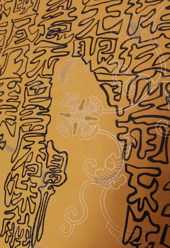 這副作品第一眼給我的感覺就是超凡脱俗,內容為鏤空一筆空心字心經,作者採用的是琺琅彩繪鎏金工藝的上等極品宣紙,溢彩生輝,多少年來我還是第一次見過(只是傳説聽過)結構安排整體一個字—“妙”。