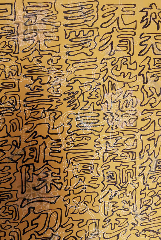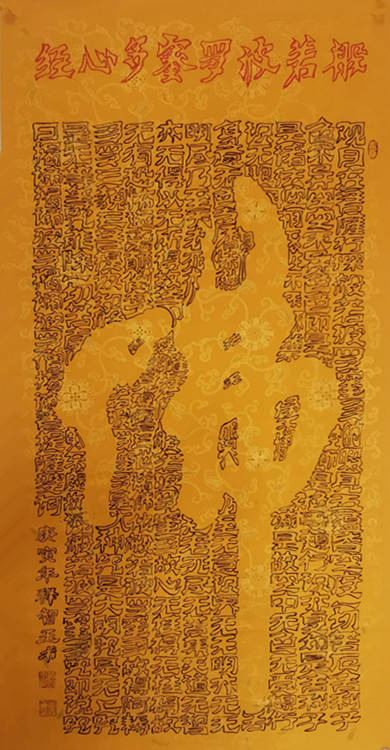 第二種表現手法:作品中間部分有個“佛”字,形狀好比一個弟子拜觀音的造型,這個“佛”字並不是寫出來的,而是由眾多小空心字書寫時候巧妙地留白空出來的,這個空是宣紙的本相。但是我們感覺到空的存在。征服作品巧妙地表達了“空即是色,色即是空”的因果循環。