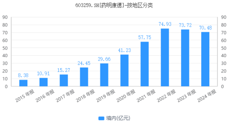 憑藉着創新藥制度紅利、產業鏈一體化優勢以及本土化成本優勢,藥明康德發展極其迅速。2015年-2023年,藥明康德主營業務收入由48.83億元增長至403.41億元,淨利潤由3.49億元增長至96.07億元,八年內營收增幅超過7倍,淨利潤增幅更是超過27倍。2022年7月,藥明康德股價攀升至172.49元的歷史新高,總市值突破5000億元,力壓恆瑞醫藥成為A股市值最大的醫藥企業。