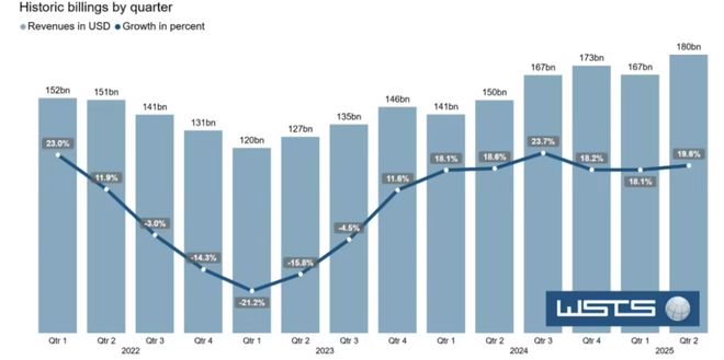按時間劃分,一季度市場規模約1670 億美元,同比增長 18.1%;二季度約 1800 億美元,同比增長 19.6%。