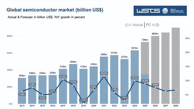 WSTS 同時將對 2025 全年世界半導體市場規模的預測上調至 7280 億美元,這一數據較 2024 年提升 15.4%;而 2026 年半導體市場規模則有望達到 8000 億美元,進一步同比增長9.9%。