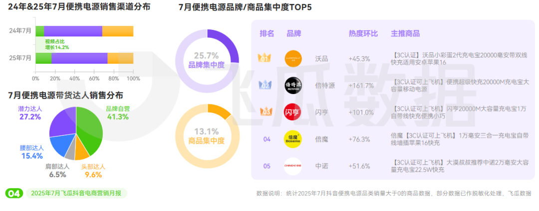 近期,充電寶行業引發的安全風波讓品牌在銷售宣傳與賣點定位上皆做了調整。從抖音7月便攜電源品類銷售分佈來看,同比去年帶貨視頻的佔比增長了14.2%,品牌自營的帶貨成效越發突出。從頭部品牌主推的系列商品來看,“3C認證、可上飛機”賣點成為必備關鍵詞。