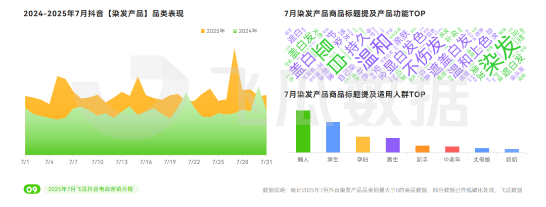 從7月抖音染髮產品的品類表現來看,整體呈波動增長。從產品主推功能上,“蓋白髮”“温和”“持久” 等為核心訴求,貼合消費者對染髮效果與體驗的追求/