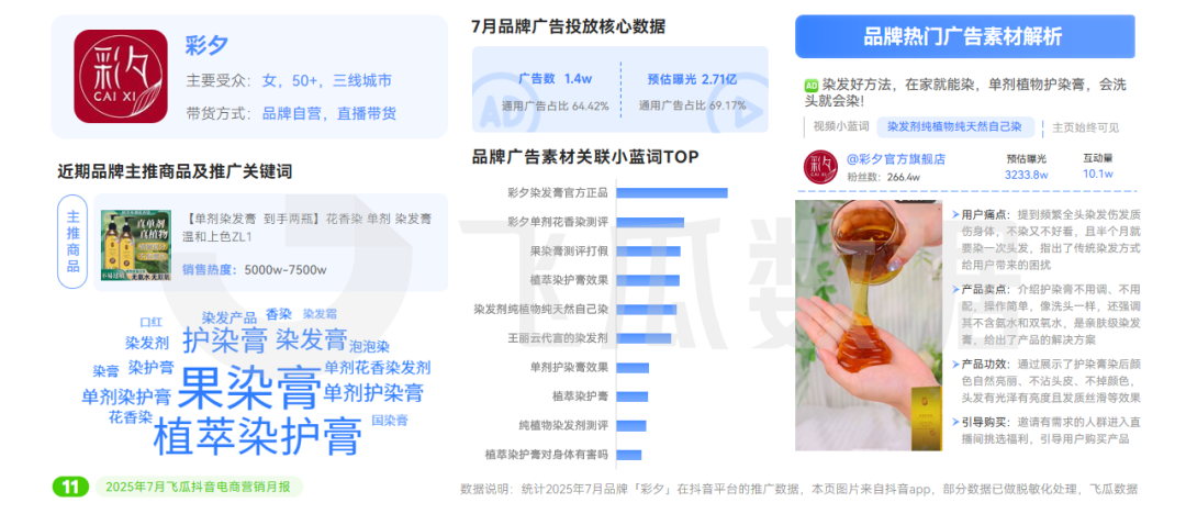 同時,精準捕捉銀髮羣體對 “安全 + 便捷” 的需求,突出 “像洗頭一樣簡單” 的體驗,輔以 “自然蓋白、不傷頭皮” 功效演示,引導進直播間鎖福利,實現細分市場突圍。