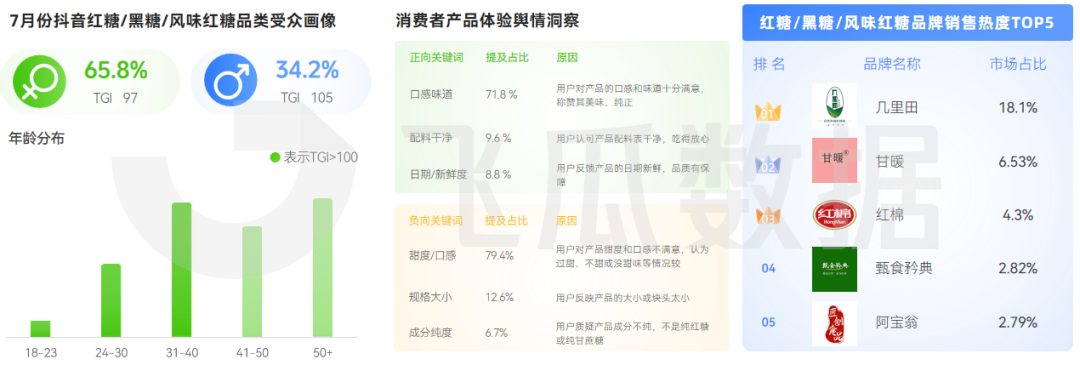 飛瓜數據顯示,7月抖音調味品相關品類的銷售熱度,在環比和同比上均呈雙位數增長。其中食用糖表現較為亮眼,銷售熱度同比增長顯著,達到42.06%。在食用糖細分品類裏,紅糖 / 黑糖 / 風味紅糖佔比最高,冰糖次之。整體來看,調味品市場呈現出調味料、調味醬引領銷售熱度的態勢,消費者對糖類調味品的需求增長較為明顯,可能與季節、消費習慣等因素相關。
