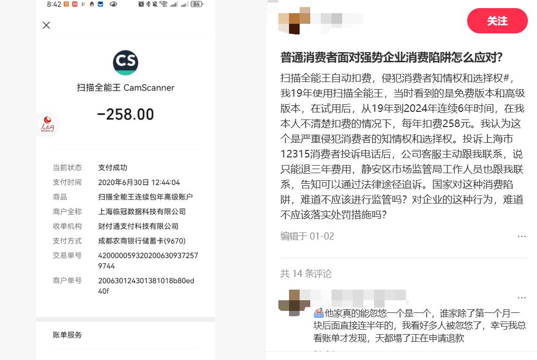 社媒平台上也有不少網友提到,“掃描全能王1元試用後會默認開啓自動續費,自己的錢包被悄無聲息划走了幾個月的會員費才注意到”;甚至有用户是被自動扣款6年後才知曉此事,不得不打12315投訴要求退款,最終也未能追回全部費用。