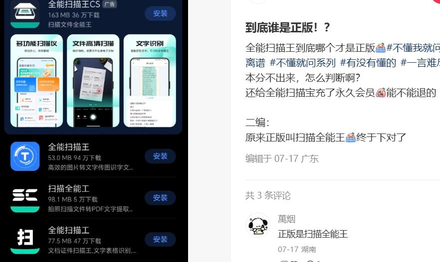 同時,掃描全能王還面對“山寨”“盜版”產品的侵襲。手機應用商店裏有多個和“掃描全能王”的名稱及logo都高度相似的“山寨”應用,使得不少用户被誤導;合合信息倘若不予以維權治理,長期下來也會對口碑形象和用户體驗造成影響。