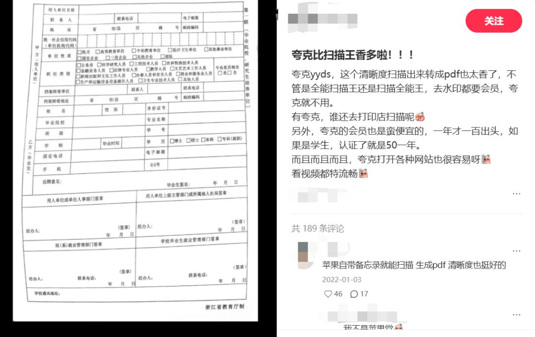 從社交平台的討論度來看,目前夸克掃描或是掃描全能王的“頭號競爭對手”。社媒平台有用户表示,夸克掃描轉PDF的清晰度相當好,掃描導出的功能還可以免費使用;相比之下,夸克掃描會員的價格(連續包月25元/月)也要比掃描全能王(連續包月30元/月)更加划算。