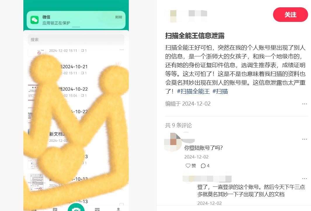 “趣解商業”注意到,小紅書上還有網友表示,自己掃描全能王賬號上出現了別人的文檔,包括身份證複印件信息,選調生推薦表,成績證明等,出現原因暫不清楚,但這加重了用户使用的不安全感,“這信息泄露如此猝不及防,是不是也意味着我掃描的資料,也會莫名其妙出現在別人的賬號裏?”