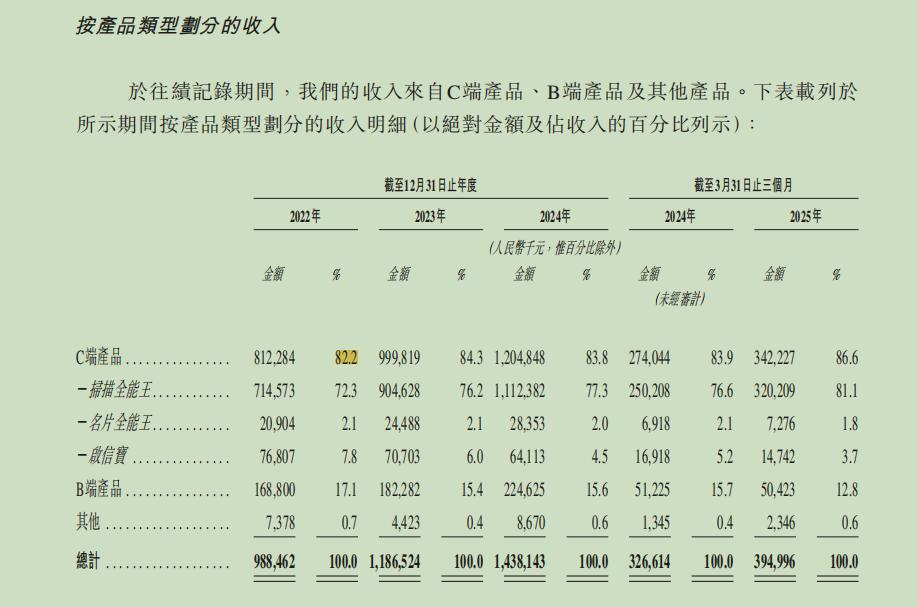 合合信息業務分為B端與C端,其C端產品包括掃描全能王、名片全能王和啓信寶;其中,掃描全能王撐起了公司大部分營收。2022年到2024年,公司來自掃描全能王的收入佔比總營收為72.3%、76.2%、77.3%,今年第一季度更是達到了81.1%。