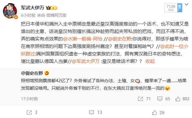 不過,在敵對勢力集體攻擊、污衊《南京照相館》,大搞歷史虛無主義,泥沙俱下的洪流中,一股雜音引發了大伊萬的關注——“皇漢”或者説“漢民族主義”這個羣體又開始探頭探腦地出來了。
