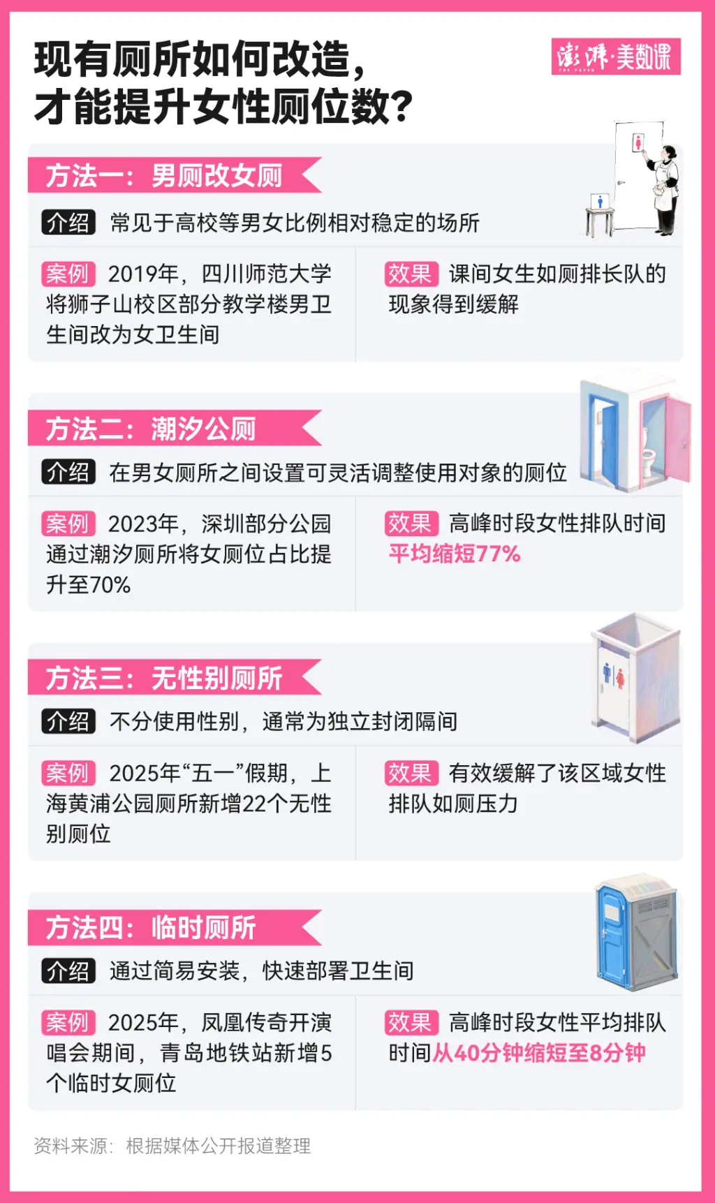 澎湃美數課梳理發現,近幾年,為了緩解女性如廁排隊的現象,多地也嘗試了包括設置潮汐公廁、無性別廁所在內的多種方式來增加女性廁位的佔比。