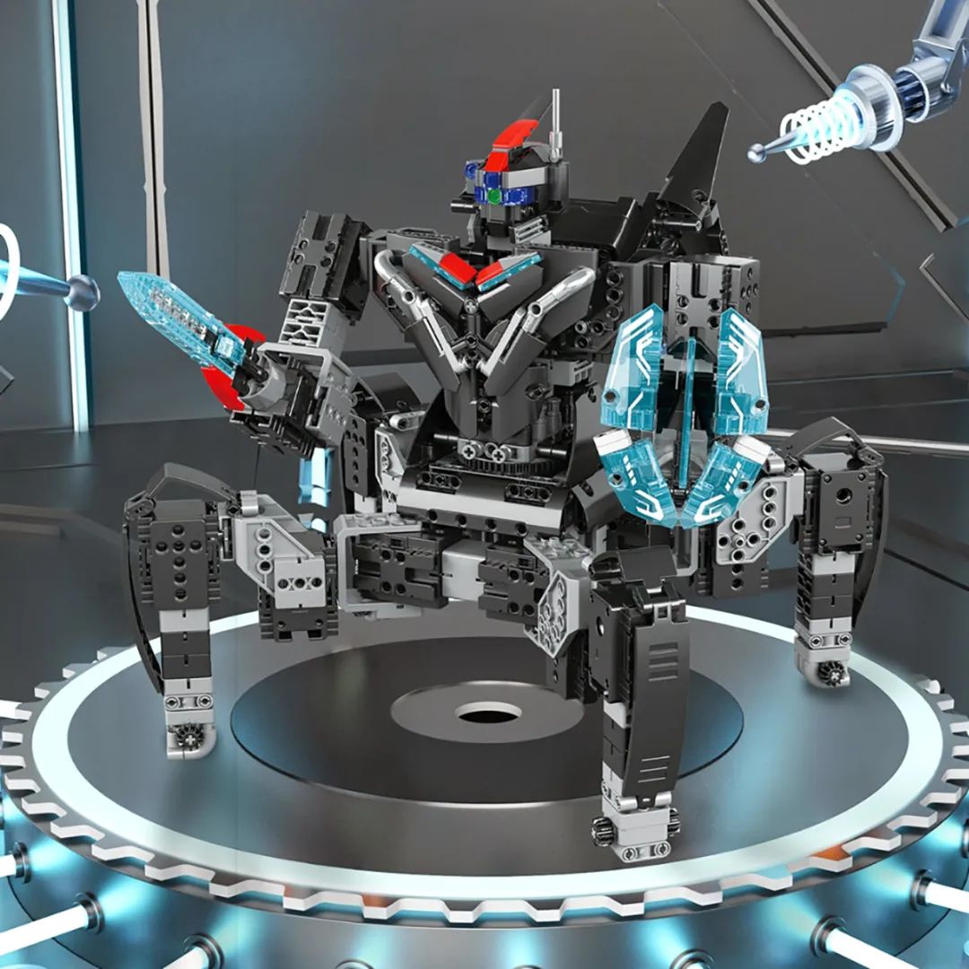 澄海的玩具產業,這兩年也在搞高端化+智能化。比如來自澄海區的羣宇互動就推出了**智能拼插積木機器人玩具。**玩家可以對拼插機甲進行編程,玩家間對戰時還支持體感操作,揮動控制器機甲也會做出相應的動作。