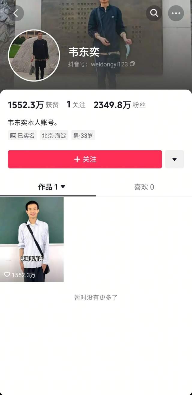 “北大韋神”韋東奕首次開通抖音賬號,只出鏡説了三句話,漲粉近2350萬;