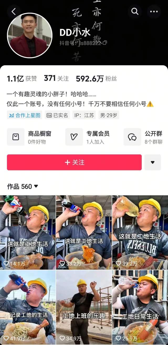 比如葱油餅攤主“跳投哥”,憑藉模仿投籃的投餅動作走紅,一天漲粉277萬,但熱度很快就過去,目前的總粉絲數也只有286.6萬;“DD小水”憑藉“工地吃播”走紅,單月漲粉217萬,直播最高10萬+同時在線,截至目前積累了592.6萬粉絲,也顯得有些後勁不足。