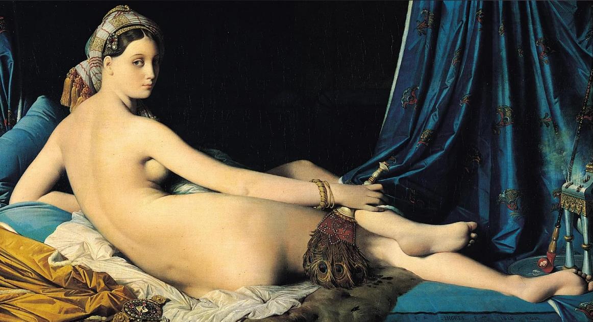 安格爾 1814 年受那不勒斯公主卡羅琳・莫拉委託創作的《大宮女》,描繪了東方土耳其宮殿裏的裸體宮女,融入東方元素,以獨特的手法展現女性韻味,借東方主義滿足巴黎新興資產階級的獵奇欲。