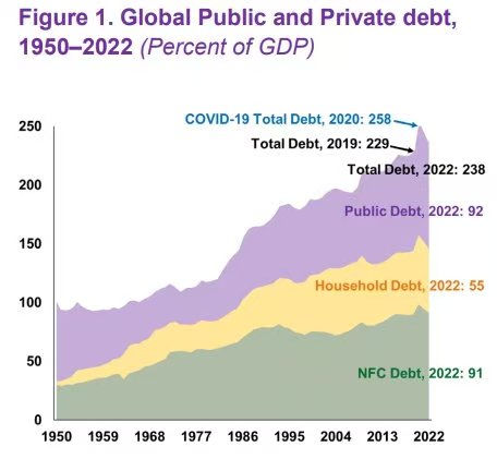 1. IMF在2023年發佈了全球債務統計,有一個結論:2008年以來,全球債務佔GDP的比例 增加,有一半是中國乾的。圖一,總債務佔GDP的比例,中國在2000年是137.9%,2022年增長到了272.1%。而美國同期是從218.3%增至273.9%,增幅小多了。由於中國經濟體量也很大了,就成為全球債務佔GDP比例上升的主要動力。