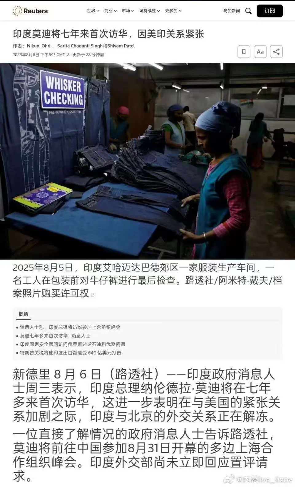 值得注意的是,就在媒體報導莫迪即將訪問中國之前,特朗普剛剛對印度實施嚴厲的關税懲罰措施,白宮週三宣佈,對印度徵收額外25%的關税,從而使對印度的總關税達到驚人的50%。這是美國對亞洲國家所徵關税中最高的。